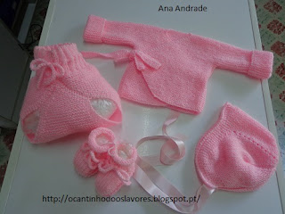 Conjunto alegre e bem disposto. Casaquinho para ele, capinha para ela, botinhas e mantinha para os dois