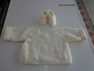 O trabalho foi tricotado com fio de bebé, marca Rosários/Caricia, enriquecido com Aloé Vera