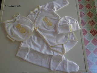 100% algodão branco e alegrado com um simpático coelhinho em arte aplicada