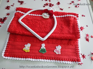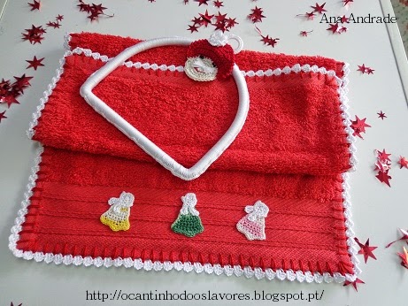 Pano de prato, com barradinho a toda a volta de crochet, com os tons de Natal, verde e vermelho, como manda a tradição.